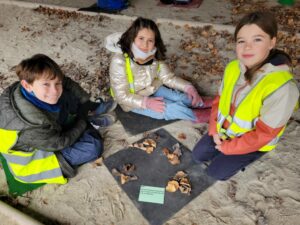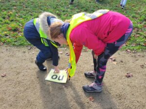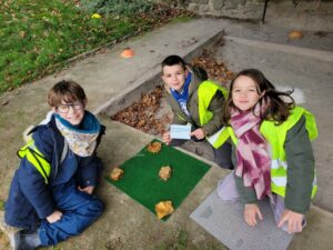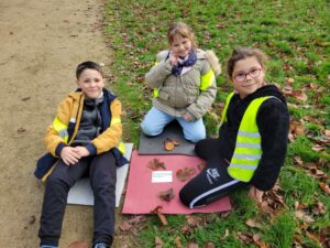 Nous sommes allés près du terrain de boules pour l’école dehors. Nous avons fait un béret sur les ou /où. On a résolu des problèmes avec des fractions en cherchant des étiquettes sous les plots. Nous avons utilisé les éléments de la nature. Nous avons aussi pris notre ardoise pour faire la table X4 avec la maitresse. Quand nous avions faux, nous faisions des jumping jack et quand nous avions juste, nous faisions des squats. Nous avons eu aussi un temps libre où nous avons joué avec les éléments de la nature et au loup. Enfin, on a fait la dictée en faisant un relais. C’était un chouette moment !