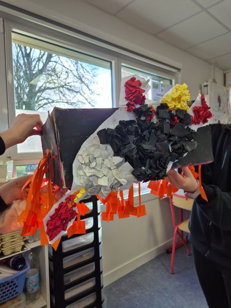 • Léonie, Camille, Mahé, Emilie et Marc : La forêt de l’enfer. Nous avons réalisé une œuvre en volume qui représente un monstre mécontent car il est perdu dans la forêt. Il est entouré d’arbres qui lui bloquent le chemin. Il est tellement hors de lui qu’il mange une personne.