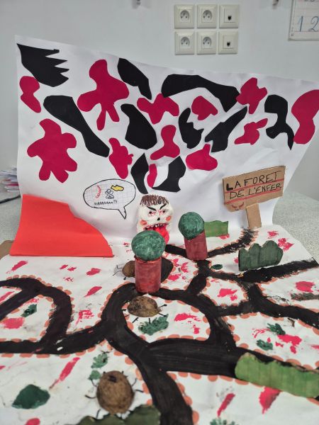 • Léonie, Camille, Mahé, Emilie et Marc : La forêt de l’enfer. Nous avons réalisé une œuvre en volume qui représente un monstre mécontent car il est perdu dans la forêt. Il est entouré d’arbres qui lui bloquent le chemin. Il est tellement hors de lui qu’il mange une personne.