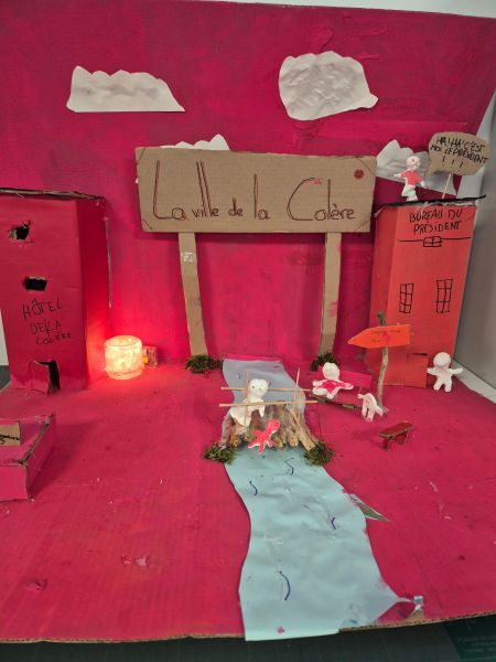 • Lindsey, Enéa, Lalie, Eden et Diego : Nous avons créé une boîte aux lettres de la colère et l’avons colorée en rouge. C’est une œuvre technique. Nous y avons mis une facture pour exprimer la colère, une tête fâchée qui sort de la boîte aux lettres et des confettis.